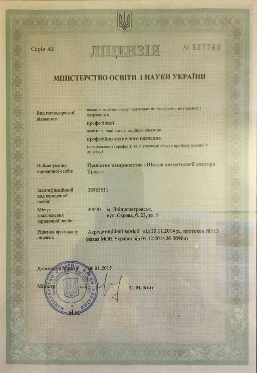 «Школа косметології доктора Траут» має ліцензію Міністерства освіти України та може навчати громадян з медичною освітою (середня та вища медична освіта), а також осіб без медичної освіти. Школа заснована у 2006 році. З того часу багато хто з випускників стали не просто успішними професіоналами, а й поповнили лави провідних косметологів України та світу.